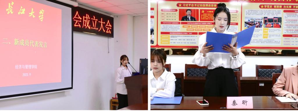 大会伊始,参会同学依次进行自我介绍。大会第二项,新成员代表王亚楠阐述了自己加入研究生会的原因与动力,并庄严承诺将积极履行自己的职责,展示自己,服务同学。大会第三项,主席团代表秦昕的发言中分享了对研究生会未来的展望:要明确自身职责,加强组织管理,突出304am永利的特色,塑造独特的研会形象。